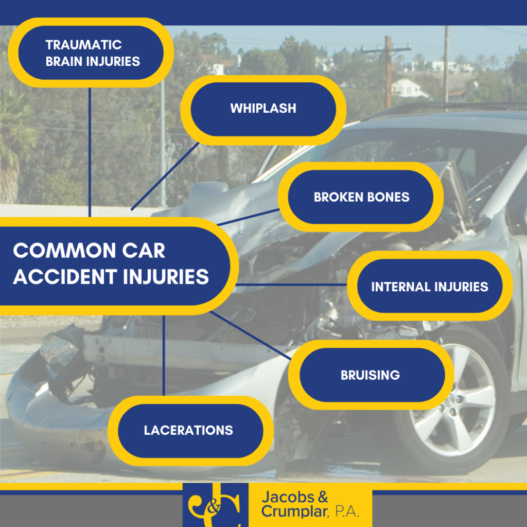 No matter the severity of the accident, injuries can still occur, even in a minor fender bender. Common car accident injuries include: